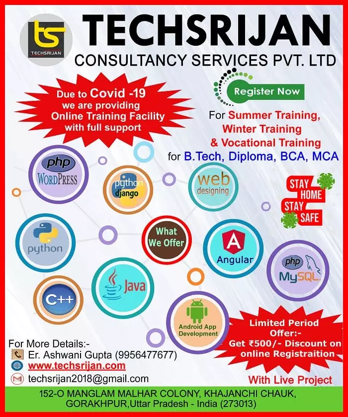 We're Offering Summer Training held in month of June & July on various technologies like Python, Java, Web Development using Php with MySql, Andriod, Nodejs, C&C++, Web Designing and Fundamentals of Computer & Networking to B.Tech/Diploma/BCA Students in Gorakhpur(East UP).